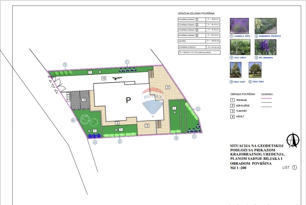 Zemljište je iskolčeno, ima projekt za kuću prizemnicu 165 m2 bruto (131,25 m2 neto površine), a sva dokumentacija za građevinsku dozvolu je predana te se ista očekuje da postane pravomoćna svaki čas (pravomoćna građevinska dozvola je u cijeni zemljišta).