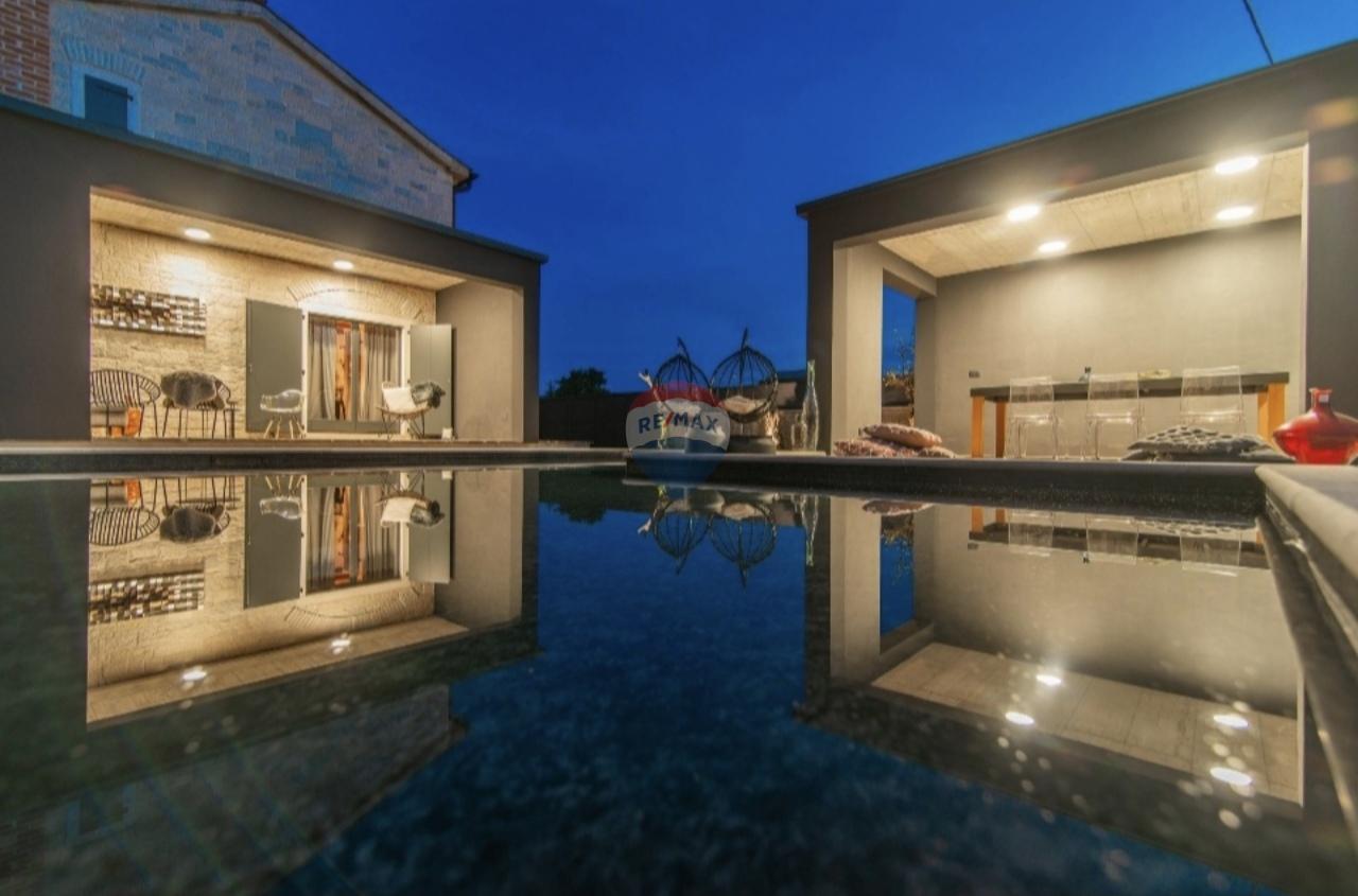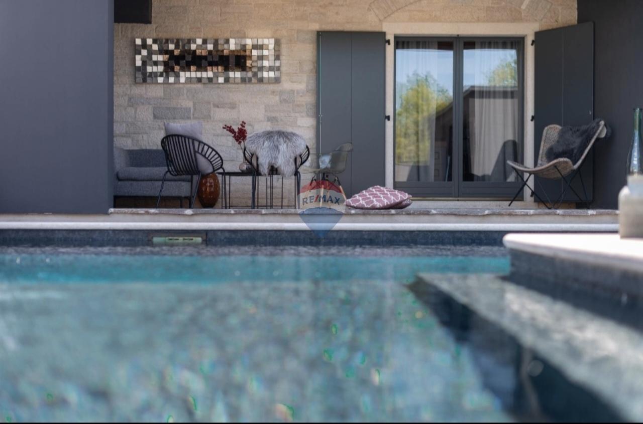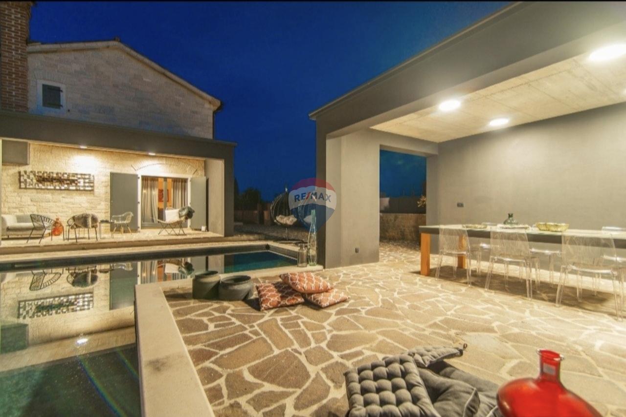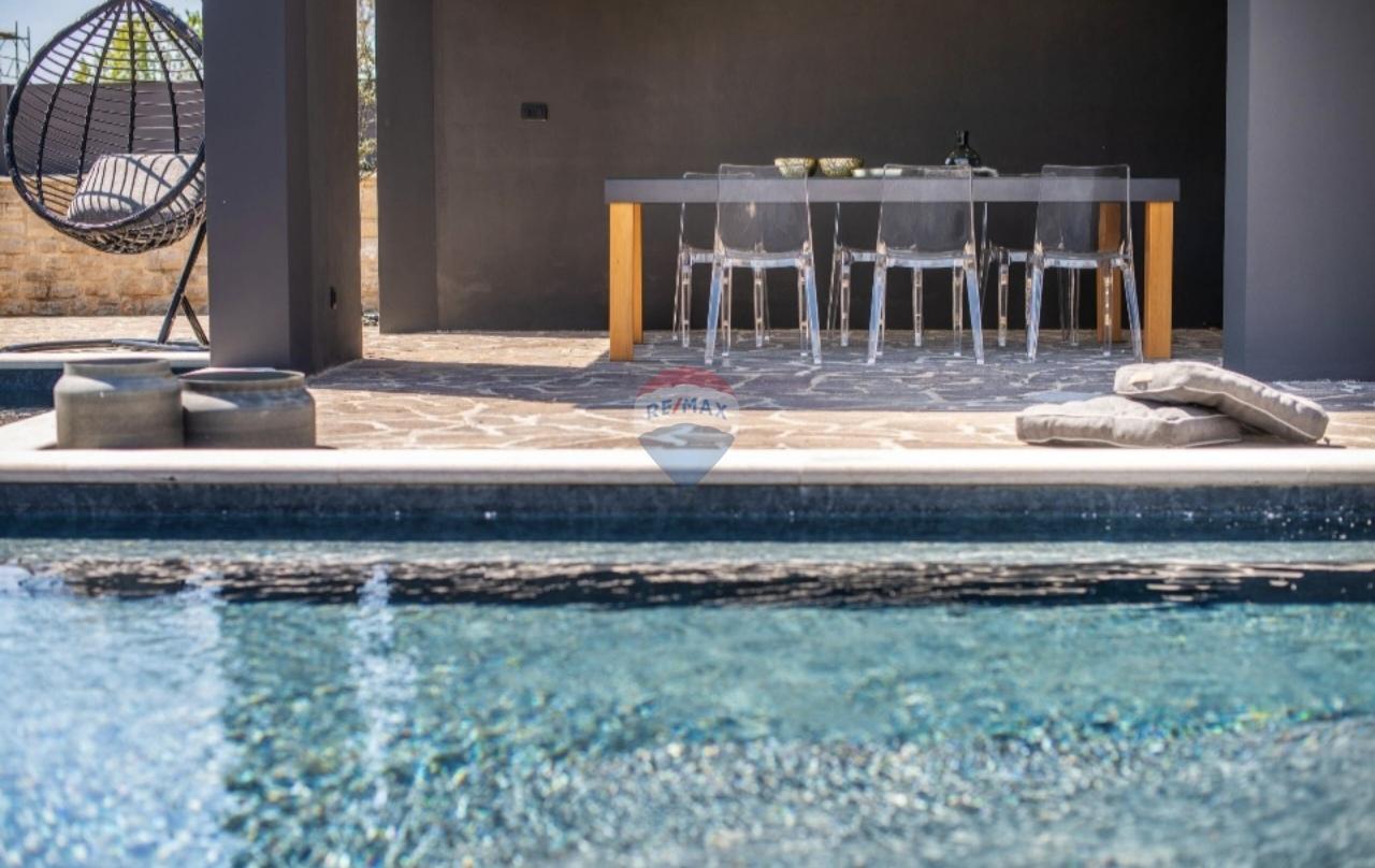 Vanjski prostor pruža savršen balans između opuštanja i druženja – uređeni travnjaci, prostrana terasa s ležaljkama te natkriveni prostor za blagovanje uz bazen stvaraju idealnu atmosferu za uživanje. Bazen je jedinstvenog dizajna, s plitkim dijelom koji ga okružuje te sustavom automatskog punjenja. Okućnica je potpuno ograđena, hortikulturno uređena i redovito održavana, čime se osigurava potpuna privatnost i ekskluzivnost. Vila ima vlastiti parking i uređeni prilaz.
