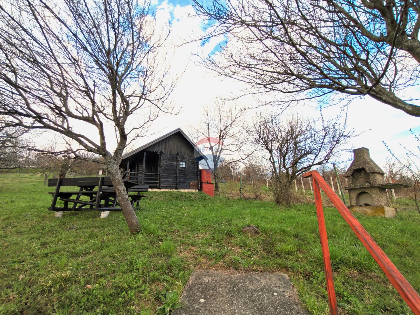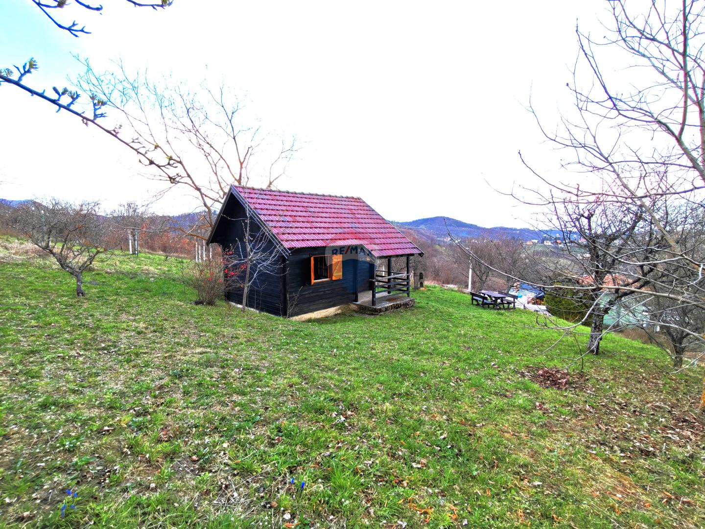 Ovo nije velika obiteljska kuća. Ovo je mala, autentična brvnara na prostranoj parceli s travnjakom koji se spušta niz padinu. Potpuno drvena, crna fasada, crveni crijep, natkrivena terasa, veliki drveni piknik-stol, kamena peć za roštilj i voćke koje već rađaju. Unutrašnjost je jednostavna i spremna za useljenje: kreveti na kat, blagovaonski stol, pletena fotelja, police i sve što je potrebno za ugodan boravak.
