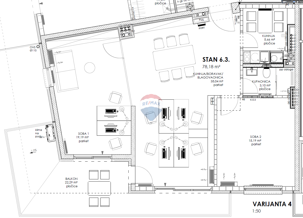 Sastoji se od tri odvojene uredske prostorije, kuhinje, toaleta, prostranog balkona s kojeg se pruža predivan pogled te se uz prostor, uz nadoplatu, iznajmljuje jedno garažno parkirno mjesto.