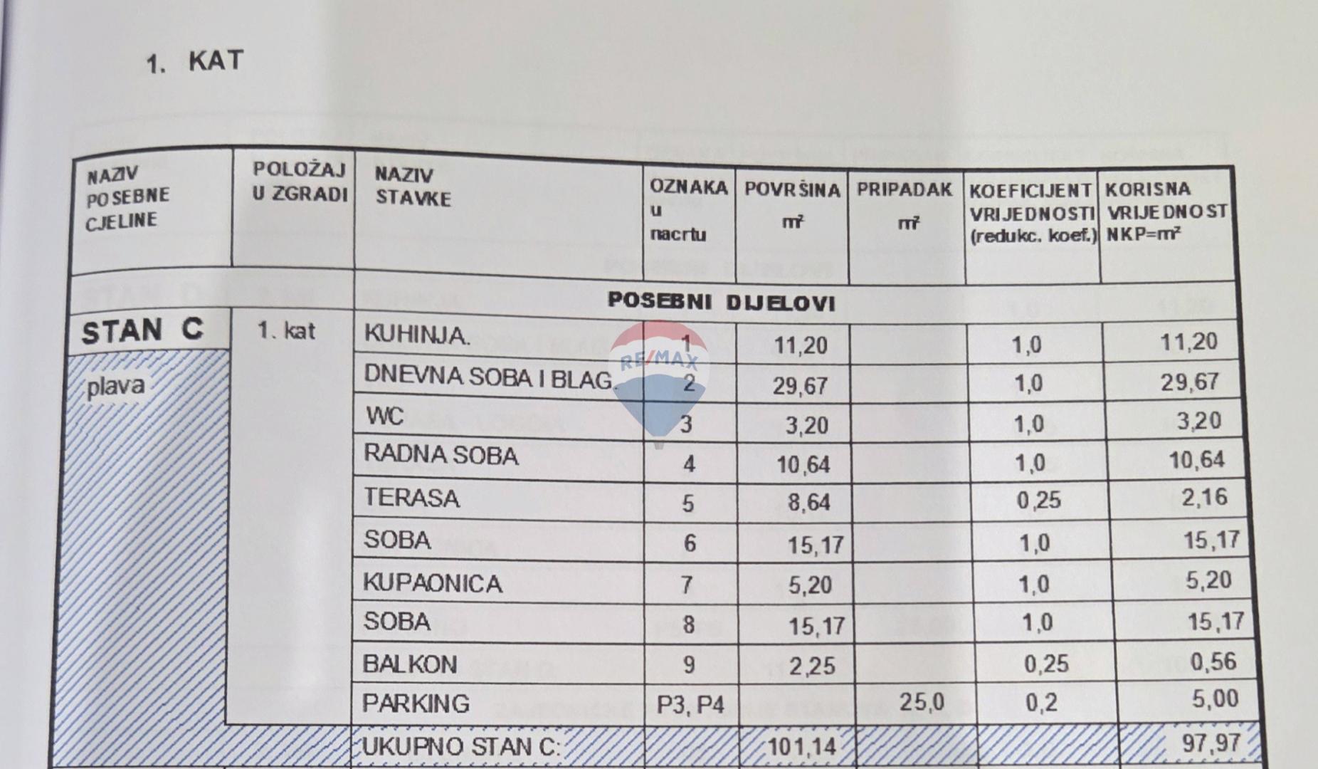 Na prvom katu stambene zgrade iz 2010. godine prodaje se veliki četverosoban stan ukupne korisne površine 97,97 m², potpuno namješten i idealan za obiteljski dom ili atraktivnu investiciju.